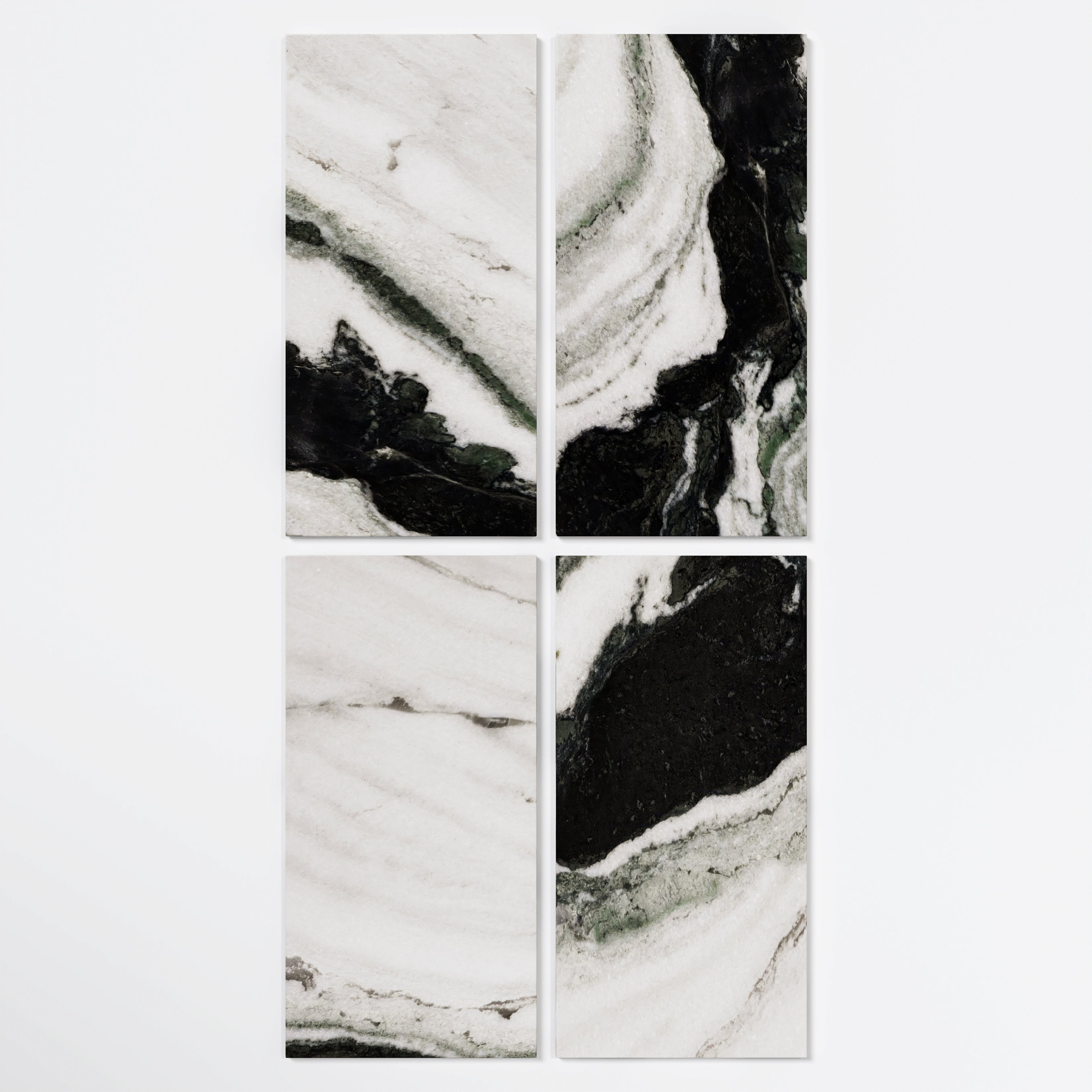 Panda marble is a striking black-and-white stone defined by bold contrasts. Some slabs are predominantly white with dramatic black veining, others more evenly balanced between the two. The Panda range is a confident, contemporary choice; perfect when you want a basin or wall to serve as a true centrepiece.