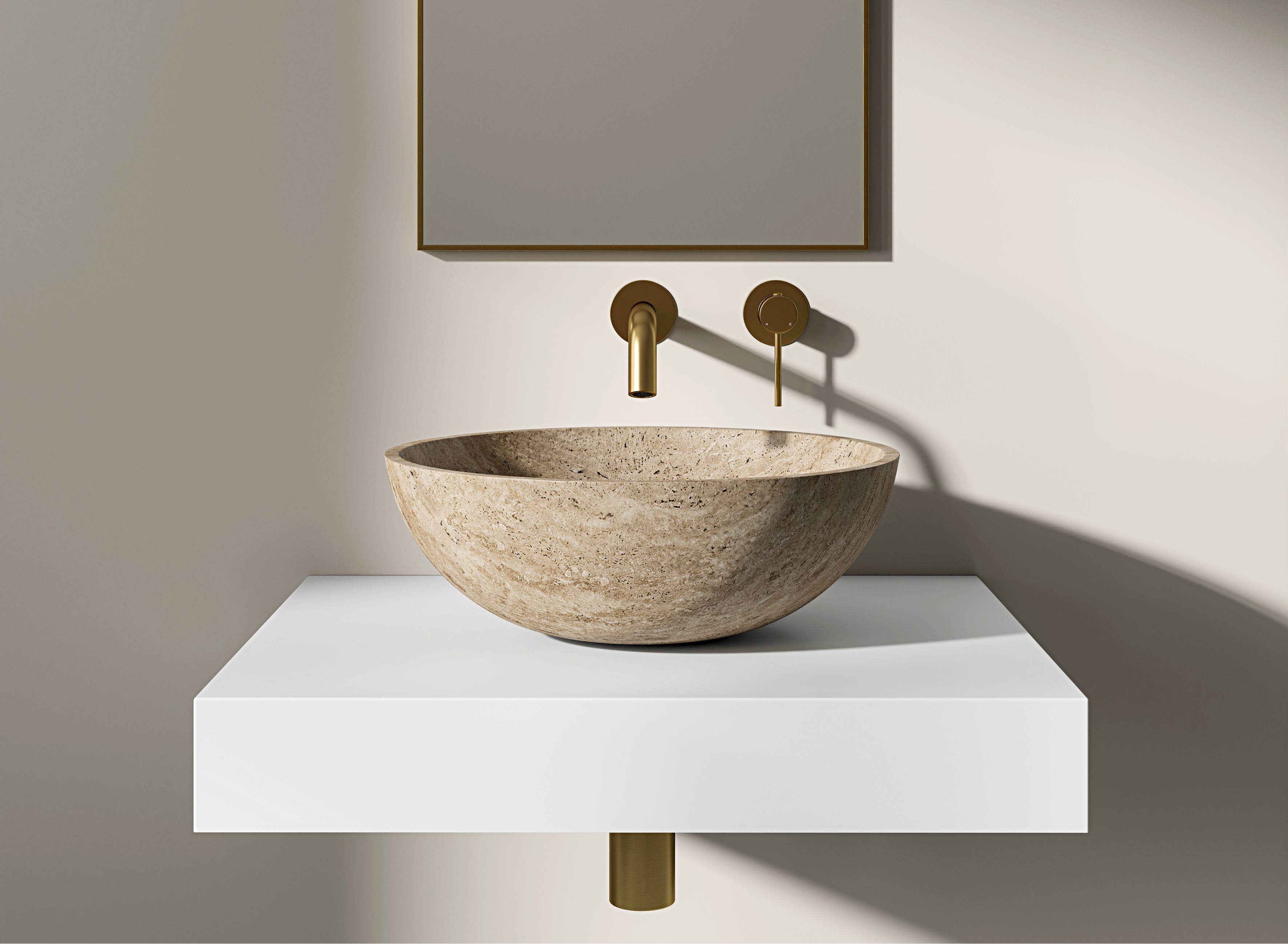 Travertine sits naturally with microcement, limewash and soft tones — think ivory, cream, beige and gentle amber. It complements minimalist, Scandi and Japandi aesthetics, and layers well with boucle upholstery, braided rugs and natural linens. Pair with understated pieces like the Nuvo Brushed Gold Mirror to complete the look.