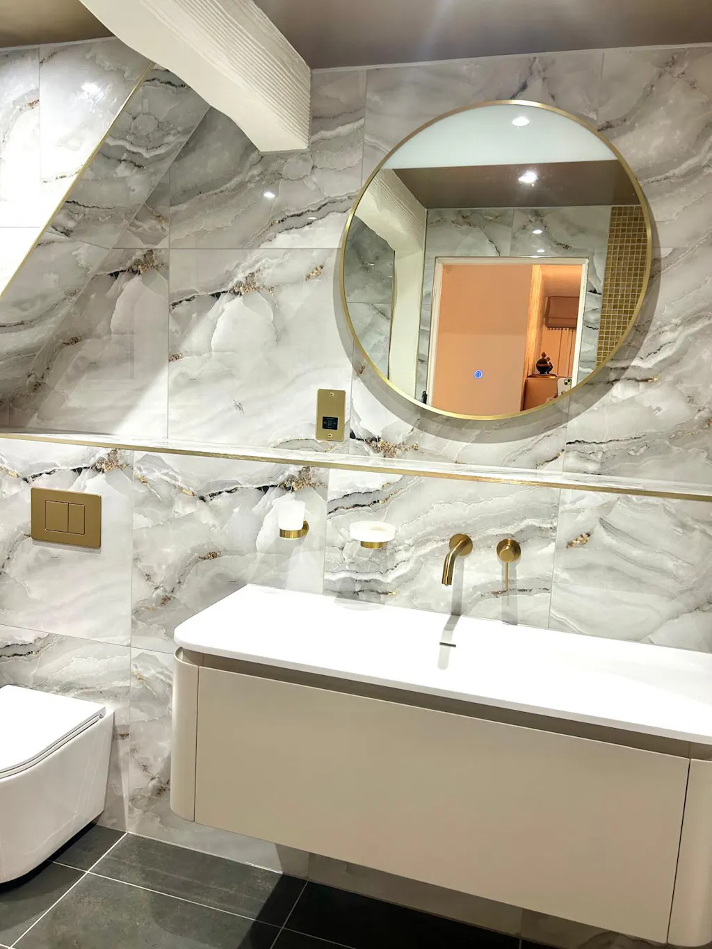 Nuvo Wall Hung Rimless Polished White Toilet with Concealed Frame Cistern & Brushed Gold Plate